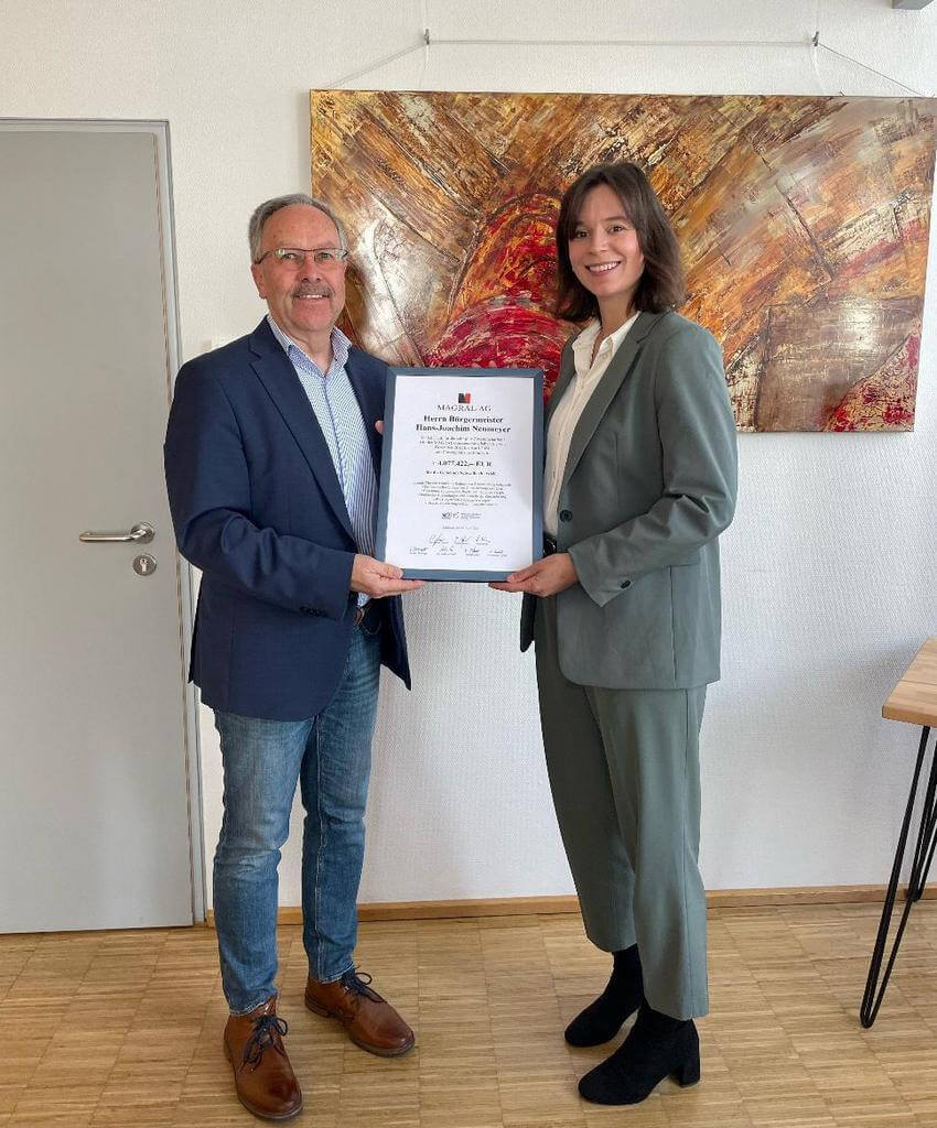 Die Mitarbeiterin der MAGRAL AG München, Frau Sophie Deininger, bedankte sich im Rahmen eines Beratungstermins bei Herrn Bürgermeister Hans-Joachim Neumeyer zum Ende seiner Amtszeit für die gute Zusammenarbeit und sein Engagement im Bundesverband öffentlicher Zinssteuerung mit einer Urkunde.