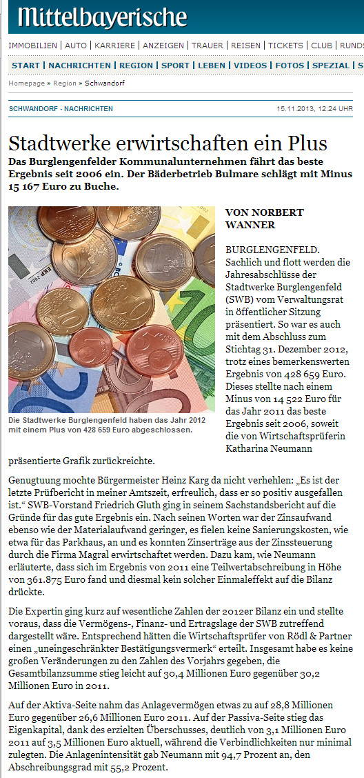 Genugtuung mochte Bürgermeister Heinz Karg da nicht verhehlen: „Es ist der letzte Prüfbericht in meiner Amtszeit, erfreulich, dass er so positiv ausgefallen ist.“ SWB-Vorstand Friedrich Gluth ging in seinem Sachstandsbericht auf die Gründe für das gute Ergebnis ein. Nach seinen Worten war der Zinsaufwand ebenso wie der Materialaufwand geringer, es fielen keine Sanierungskosten, wie etwa für das Parkhaus, an und es konnten Zinserträge aus der Zinssteuerung durch die Firma Magral erwirtschaftet werden. Dazu kam, wie Neumann erläuterte, dass sich im Ergebnis von 2011 eine Teilwertabschreibung in Höhe von 361.875 Euro fand und diesmal kein solcher Einmaleffekt auf die Bilanz drückte.